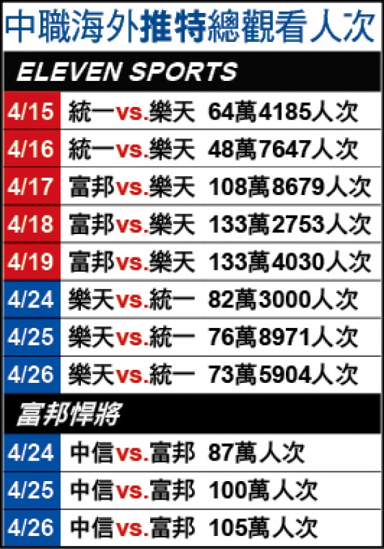 富邦悍將和ELEVEN SPORTS昨公布,上週3天推特直播共有525萬海外觀看人次,刷新單週最多紀錄,今由富邦、樂天打頭陣,整週中職賽事都提供雙語直播。