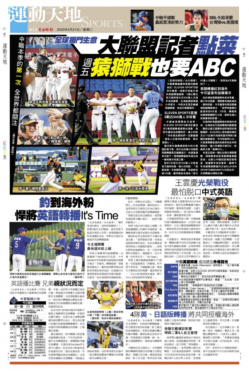 中職賽事繼續用英語向國際放送!ELEVEN SPORTS提供中職第一週樂天桃猿主場的英語轉播服務,5場比賽在官方推特吸引近500萬人次海外球迷觀看,台灣區總經理康小玲表示,今將決定是否繼續英語轉播,球迷可樂觀期待。