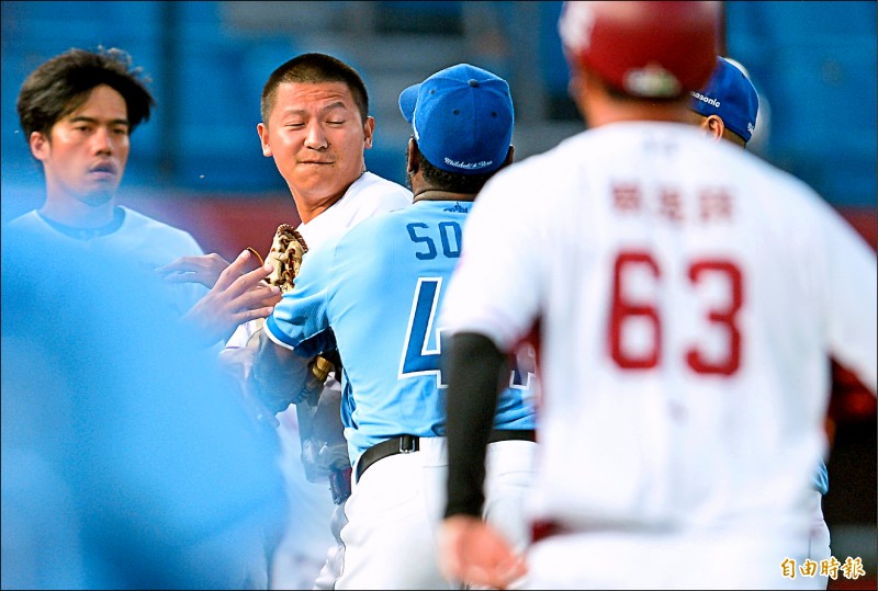 索沙投出觸身球,兩隊清空板凳。(記者林正堃攝)