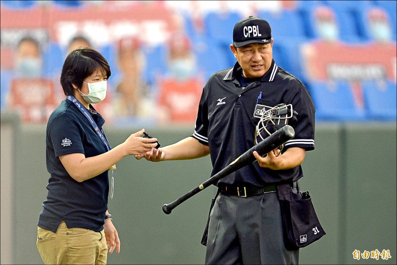 4局上猿質疑悍將林哲瑄使用的球棒不符規定。(記者林正堃攝)