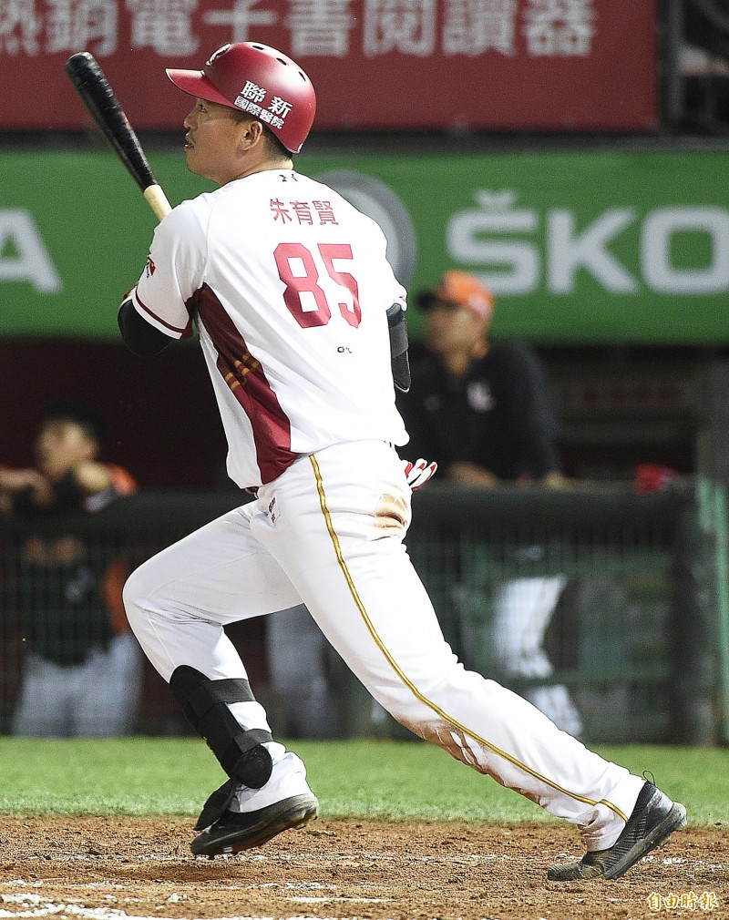 四局下,林立擊出二壘方向滾地球出局,林泓育敲左外野飛球出局,下一棒陳俊秀擊出中外野方向安打,郭嚴文也補上一支一壘安打,桃猿攻佔一、二壘。隨後手感火燙的朱育賢轟出中外野三分砲,一棒三分逆轉比分!下一棒林承飛再敲安打,但藍寅倫遭到三振。