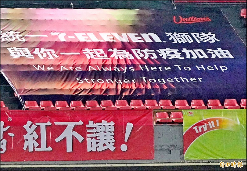 台灣連4天「0確診」,統一獅林安可昨敲出本季第3支全壘打,且小白球飛上右外野看台、剛好擊中「謝謝所有第一線防疫人員的付出,讓我們有棒球可看」的帆布,彷彿是以「0,安可」呼應致敬。(記者黃志源攝)