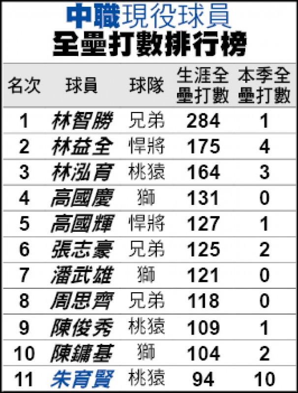 28歲的朱育賢開季13場就擊出10發全壘打,已改寫中信兄弟林智勝的最快紀錄,以目前態勢看來,他不但有望挑戰自己的半季22轟紀錄,更有機會成為中職首名單季40轟打者。朱育賢目前累積94轟,有望在本月成為中職史上第22名百轟球員。